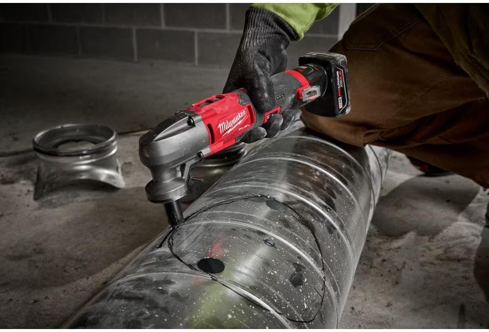 The Milwaukee M12 FUEL 16-Gauge Variable Speed Nibbler is designed for controlled cutting of sheet metal materials. It can cut 16-gauge mild steel at speeds up to approximately 7 feet per minute and is capable of handling 22-gauge spiral duct seams, 18-gauge stainless steel, and 12-gauge aluminum.