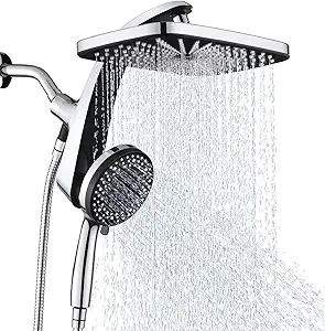Upgrade your bathroom experience with this high-pressure rain shower head system, featuring both a fixed overhead shower and a detachable handheld unit. The shower combo offers ten adjustable spray modes, allowing for a customizable shower experience from gentle rainfall to powerful massage jets.
