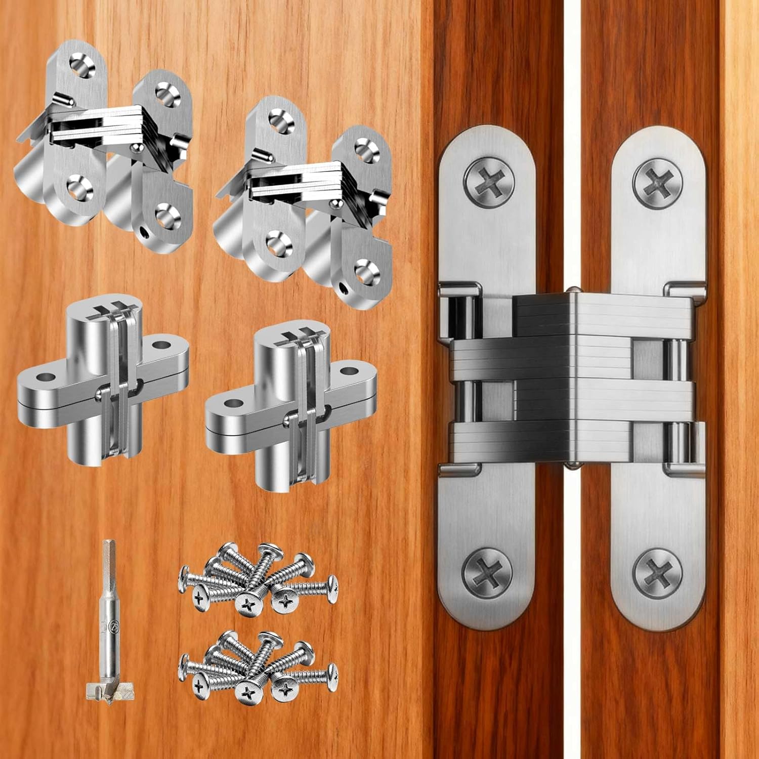 The Hidden Door Hinge Invisible Door Hinge set is designed to provide a clean, seamless appearance by remaining completely concealed when doors are closed. Engineered with a 180-degree opening capability, these hinges allow smooth and wide door movement while maintaining a minimalist, modern look suitable for cabinets, furniture, and custom DIY installations.
