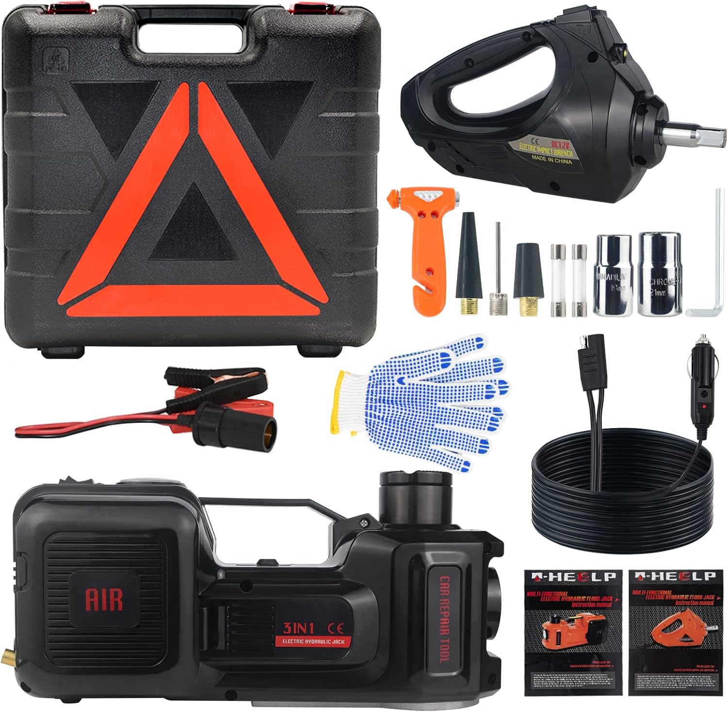 This all-in-one kit also includes an electric impact wrench for quickly loosening and tightening lug nuts, along with a built-in tire inflator to restore proper tire pressure when needed. Designed for portability, the entire system can be stored conveniently in the vehicle for roadside emergencies.