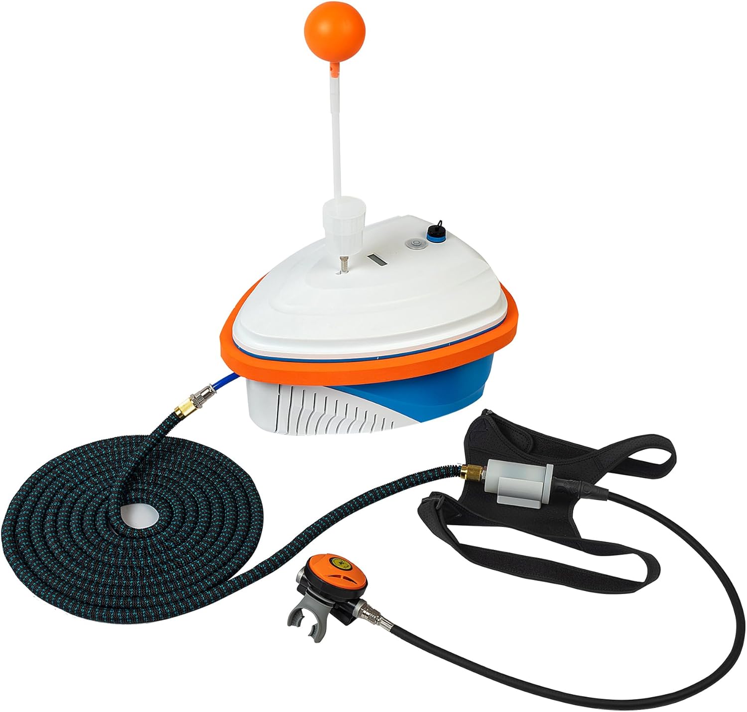 Designed for convenience and performance, the rechargeable battery system ensures extended operation, while the efficient air compressor provides consistent airflow for comfortable breathing underwater. Its compact setup also makes it suitable for boat use, shoreline diving, and underwater inspection tasks.