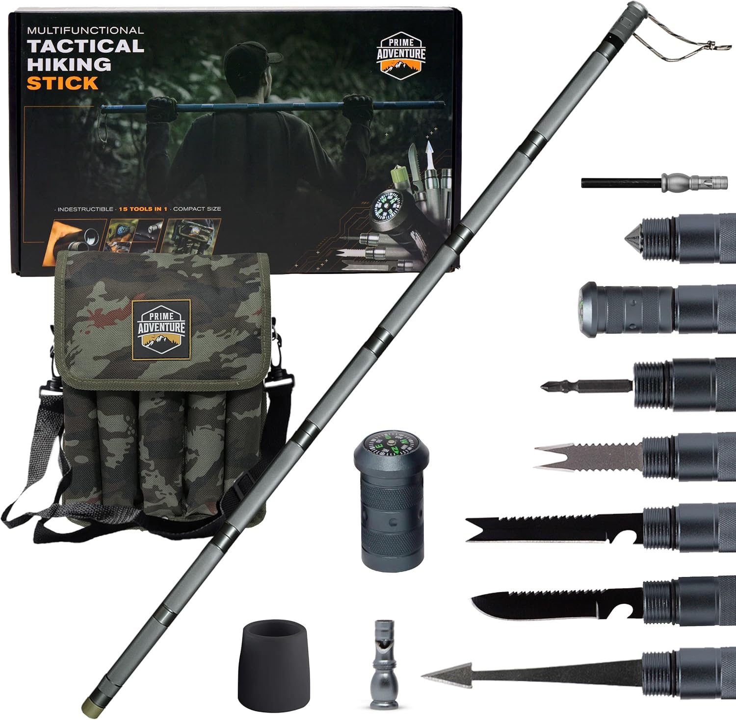 Take your outdoor adventures to the next level with the Prime Adventure 15-in-1 Tactical Survival Walking Stick, a rugged and versatile hiking staff built for explorers who demand reliability. Designed with a heavy-duty collapsible system featuring 8 durable tubes, this multifunctional walking stick combines strength, portability, and smart survival features in one compact tool.